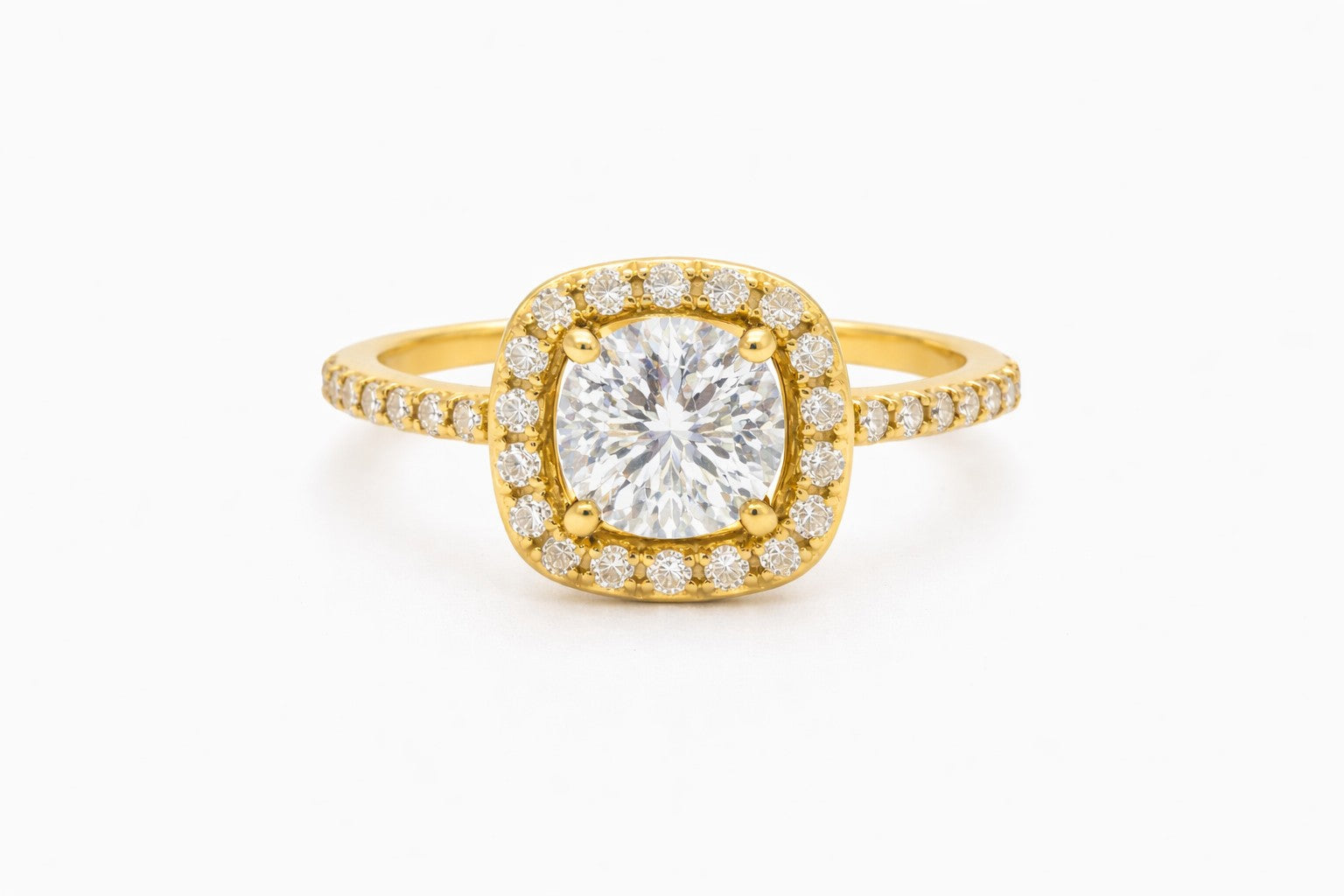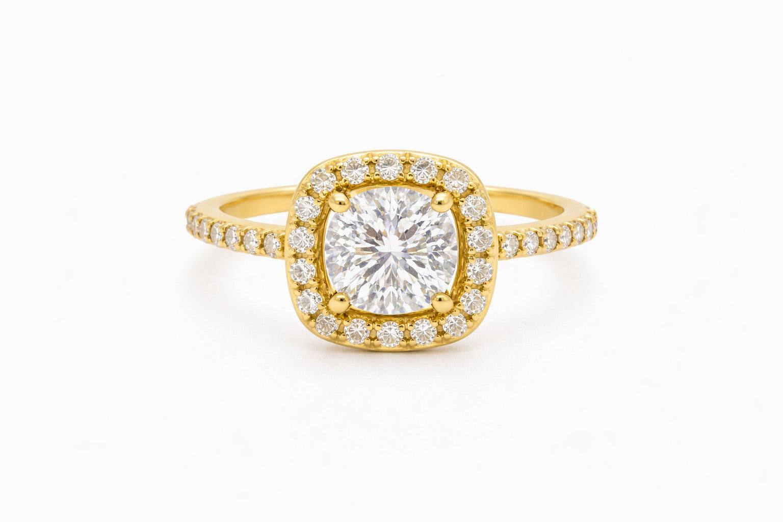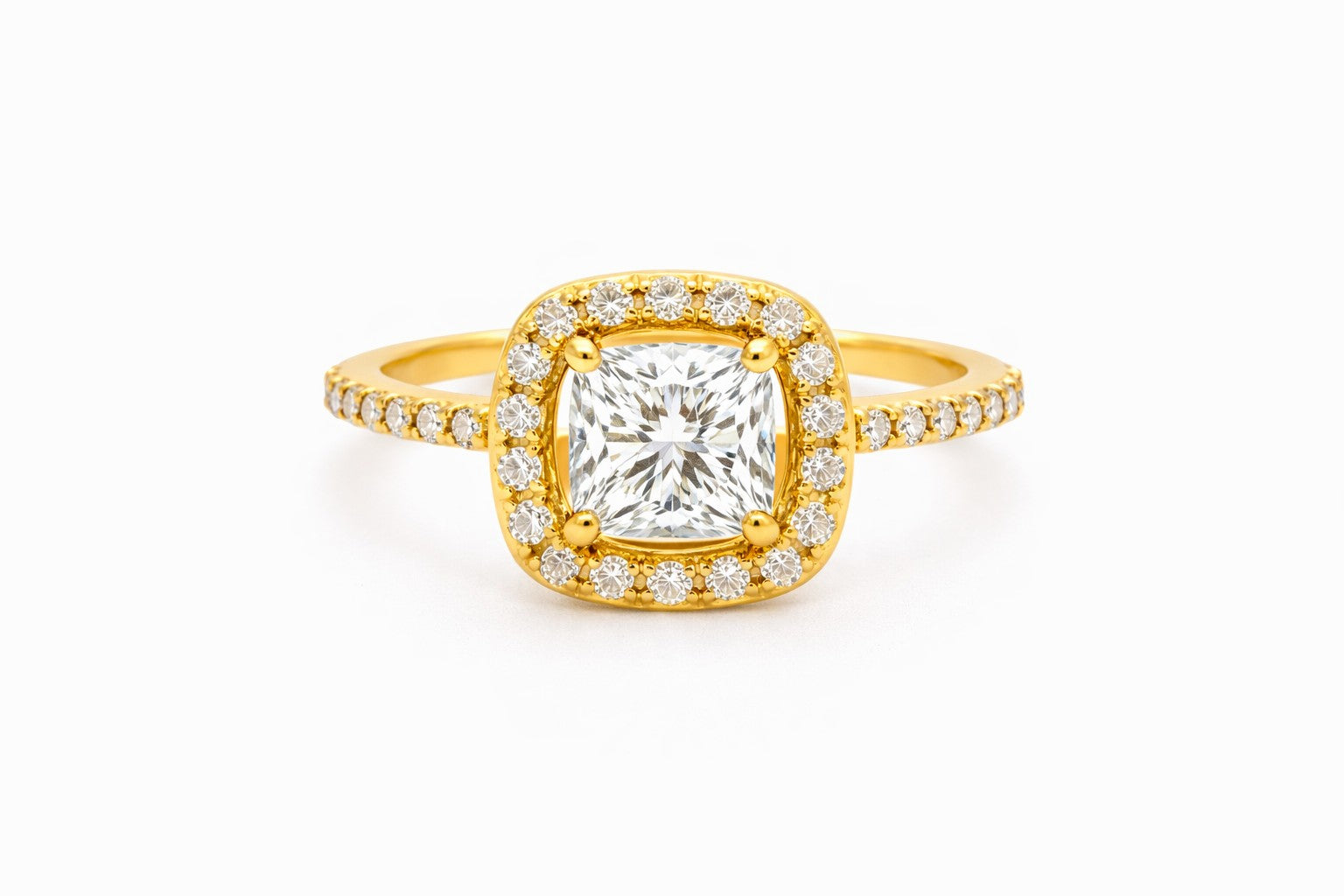 Designed to frame your love story with exceptional brilliance, this 18K yellow gold diamond halo engagement ring setting features 28 natural diamonds totaling 0.40 carats in luminous F-G color and SI1–SI2 clarity. A radiant halo surrounds your chosen center stone, while pavé-set diamonds flow along the band for sparkle from every angle.