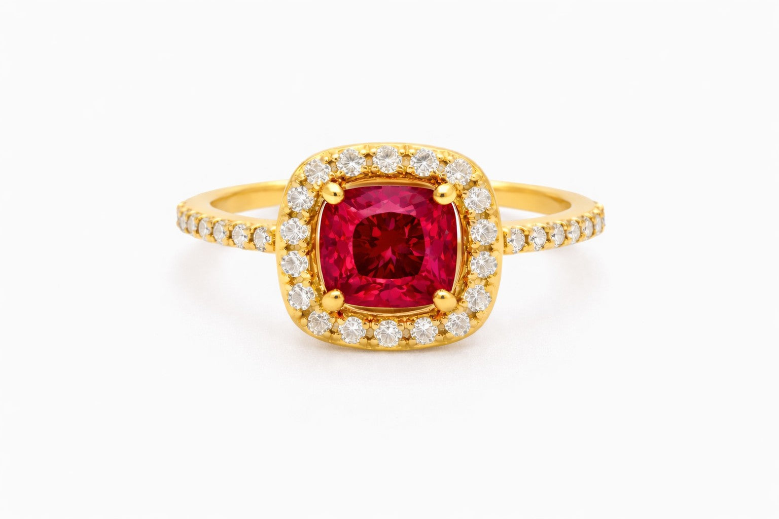 A halo enhances the perceived size and brilliance of your center stone while adding extra sparkle and dimension. Combined with pavé accents and 18K gold, this setting creates a luxurious yet timeless foundation for your engagement ring.