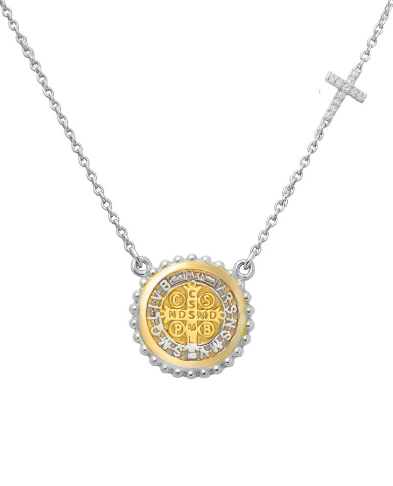 Beaded Border Mini Saint Benedict Medal with Mini Diamond Accent Cross Necklace
