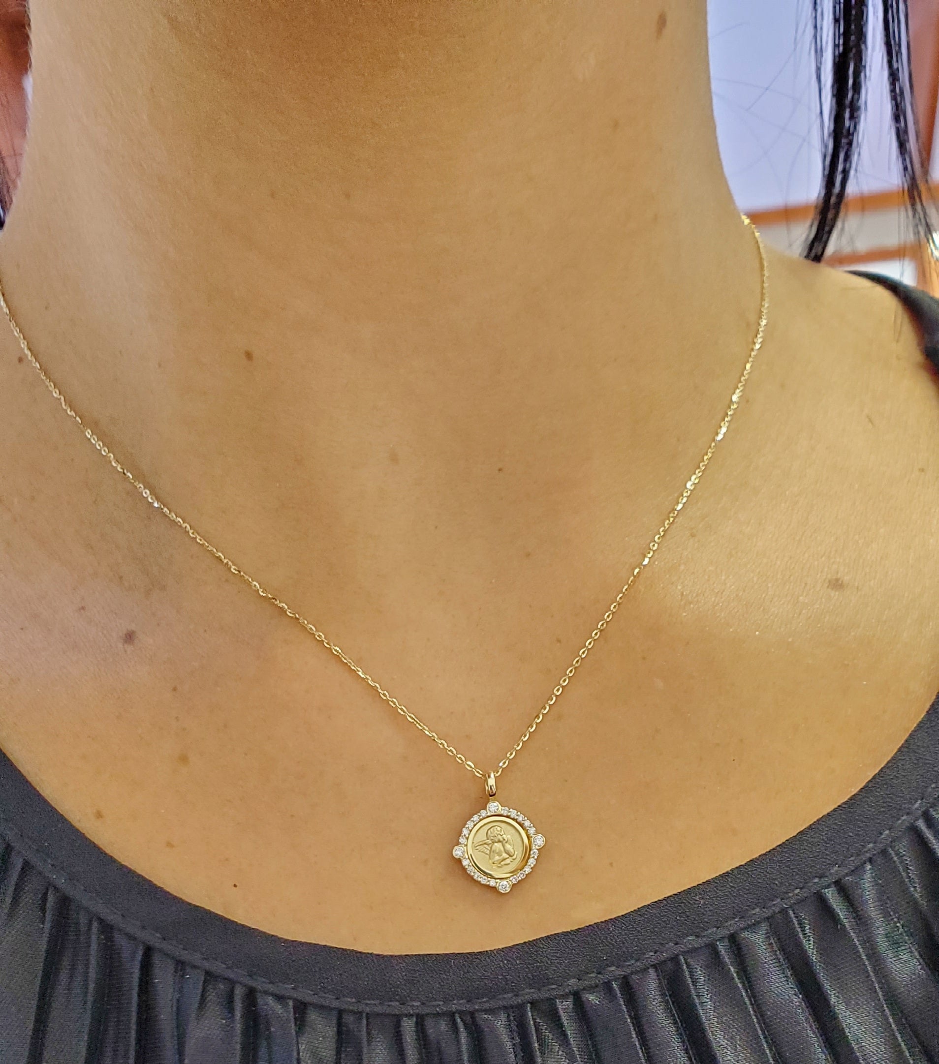 Celebrate faith and elegance with our 14K Gold Cherubim Angel Diamond Halo Necklace. Crafted in solid 14K gold, this pendant features a detailed cherubim angel, symbolizing divine protection and guidance. Surrounding the medal is a radiant halo of natural diamonds (0.15ct total weight), accented by four larger bezel-set diamonds placed at the cardinal points — representing faith as our true compass through life.
