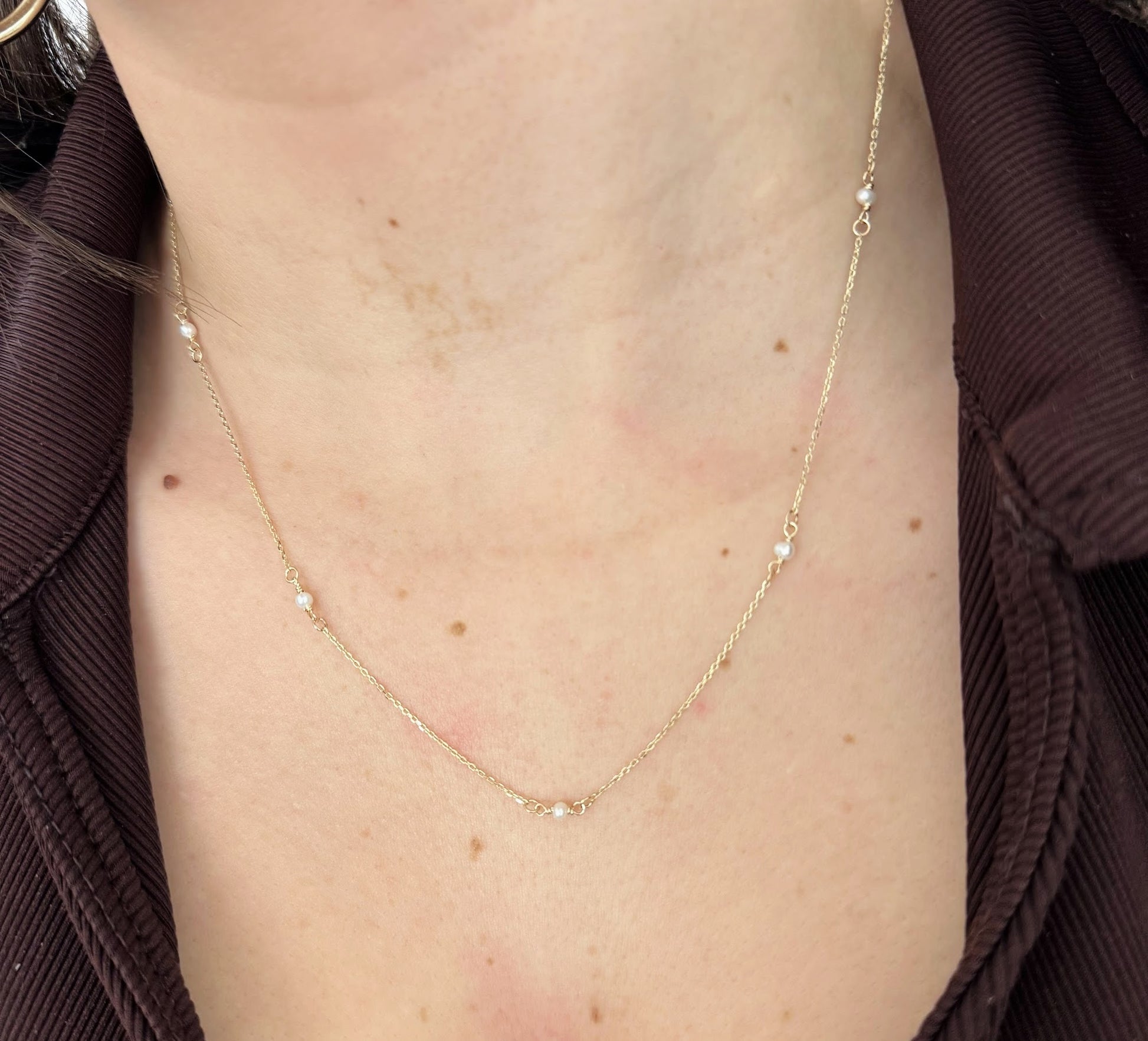 Add a touch of elegance to any outfit with our Dainty Fresh water Pearl Necklace. Featuring 3mm pearls and 14K gold stationed design, this necklace offers a 1.5" inch spacing between the pearls on a thin diamond cut cable chain (1.0mm) for a unique and sophisticated look. Perfect for any occasion, this necklace is a must-have for any jewelry collection. Thin enough so you can hang your selection of charms!