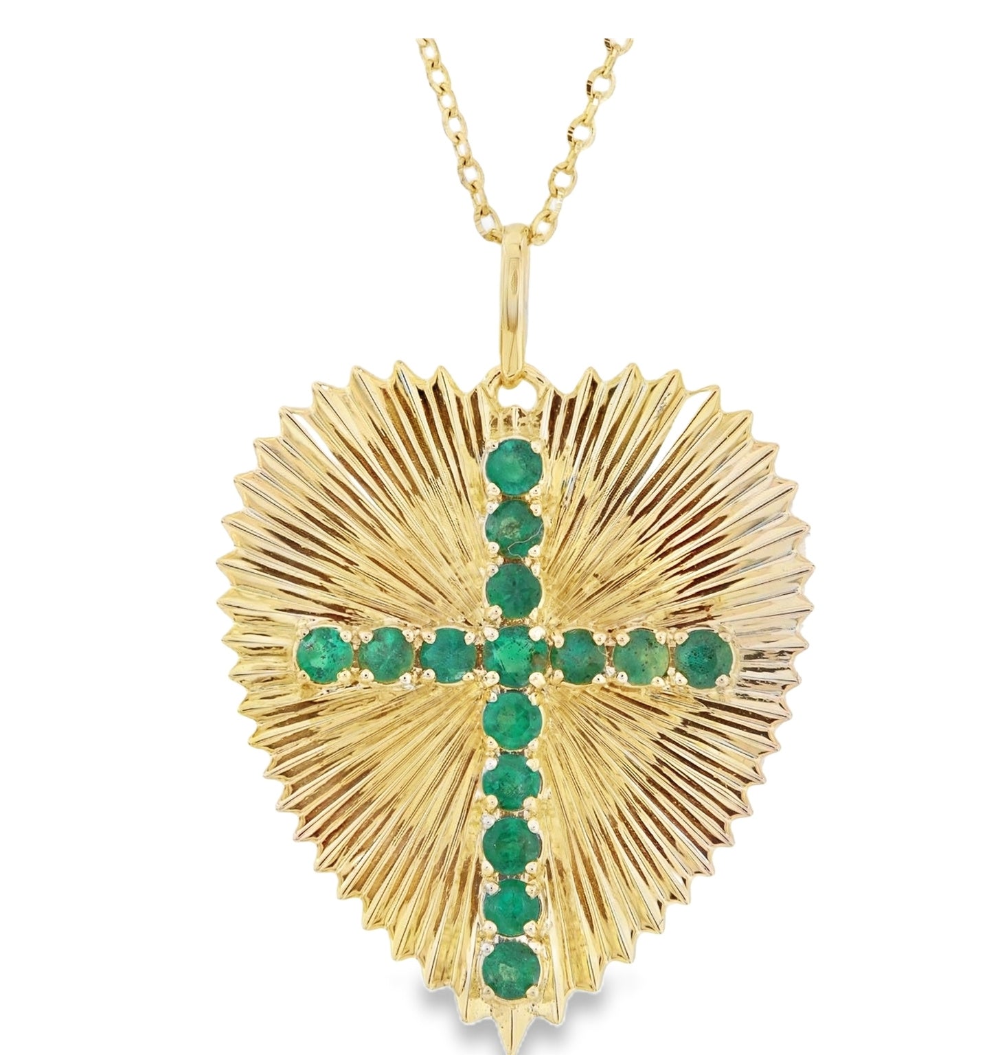 Add a touch of elegance and radiance to your outfit with our Large Radiating Gold Heart Medallion Necklace. This 14 karat solid gold necklace features a diamond cut heart-shaped fluted design medallion with a stunning natural stone cross in ruby, sapphire, or emerald (0.48ct). The adjustable 18-inch diamond cut cable chain adds versatility and is secured with a sturdy lobster clasp. Perfect for layering or wearing on its own, this necklace will surely make a statement.
