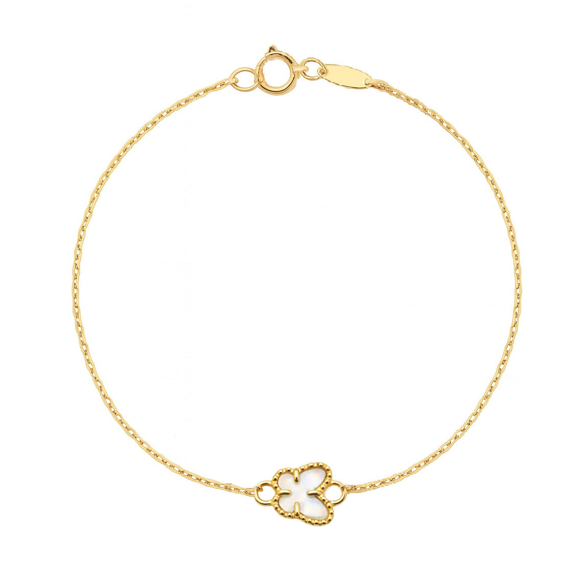 Indulge in the timeless elegance of the Mini Beaded Border Single Mother of Pearl Butterfly Bracelet, a must-have for any occasion. Meticulously crafted with 14 karat yellow gold, this exquisite piece features a stunning 6.0mm mother of pearl butterfly adorned with intricate beaded details and diamond cut accents. A delicate 1.0mm diamond cut cable chain, measuring 7" inches in length with the option to shorten it to 6.5" inches using the jump ring, elegantly suspends the flower pendant. This bracelet boasts a durable construction and secure spring ring clasp, making it both stylish and practical for everyday wear, and a cherished addition to your jewelry collection.