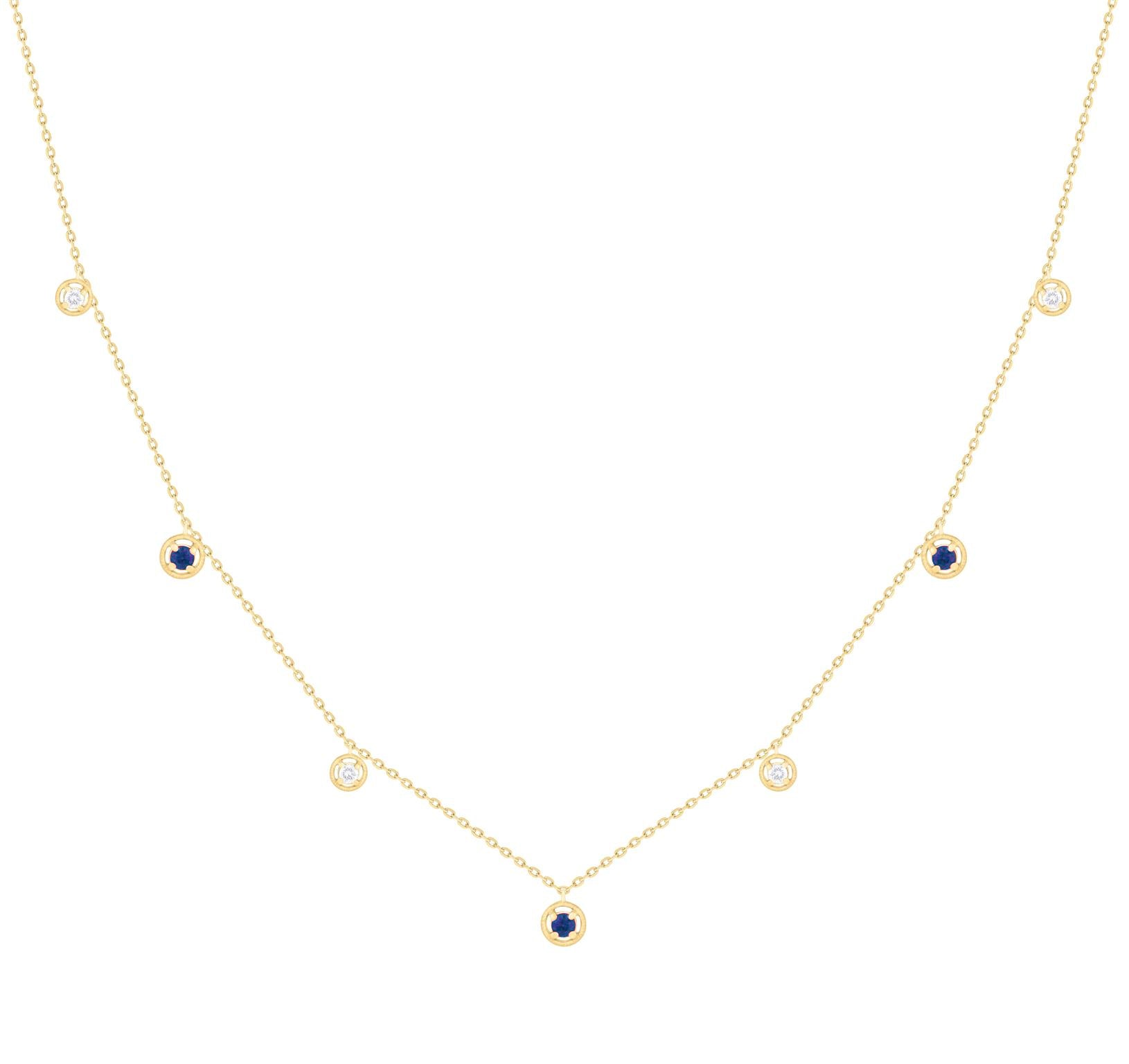 Experience the opulent allure of this 14K gold necklace adorned with striking color gemstones consisting of ruby, blue sapphire, or emerald (0.20cts) and diamonds (0.10ct),  detailed with a miniature beaded halo, suspended in stationed dangles, on a diamond cut cable chain, 1.0mm in thickness, adding a touch of class and charm to any ensemble. With an impressive length of 18" inches and jump rings at 16" and 17" inches to adjust the length, and a sturdy lobster clasp, this necklace is perfect for any occasion, infusing a sense of sophistication and refinement.