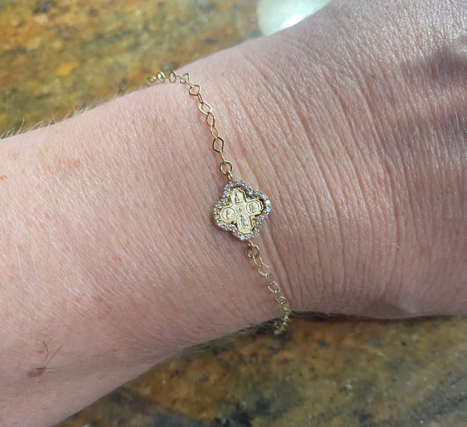 Experience true devotion with our Mini Diamond Four Way Medal Cross Bracelet. Crafted from lustrous 14 karat gold, this delicate bracelet showcases four revered saints consisting of the Sacred Heart of Jesus, the Miraculous Medal, St. Joseph and St. Christopher, in a diamond-encrusted halo, symbolizing their cherished place in the Christian faith. With a total weight of 0.12ct, this bracelet also serves as a shield of divine protection for avid travelers. Sophisticated and significant, it is a prized addition to any fine jewelry collection.