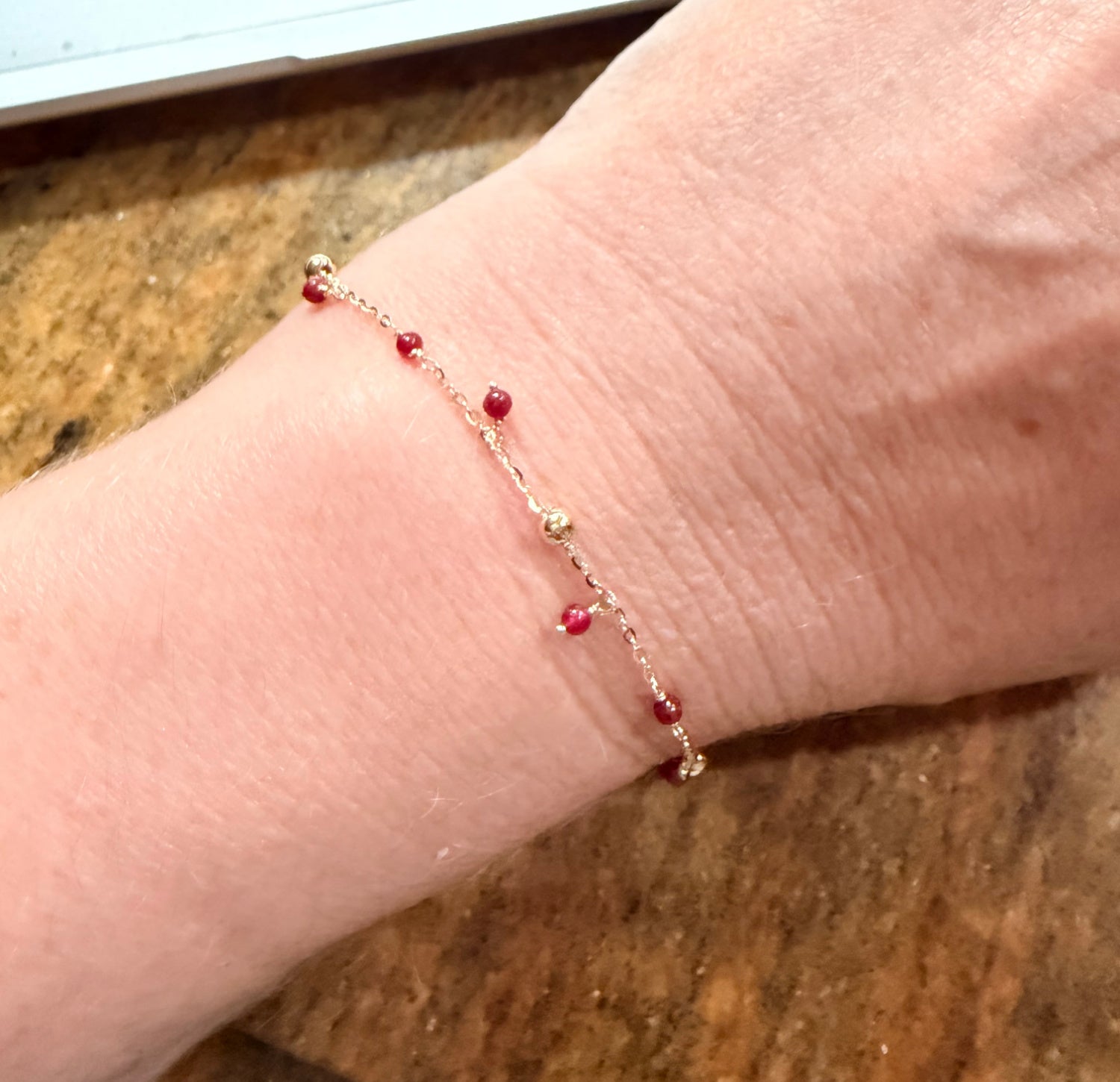 • Design: Alternating 2.0mm red or green dangling bead agates and 3.0mm polished gold beads