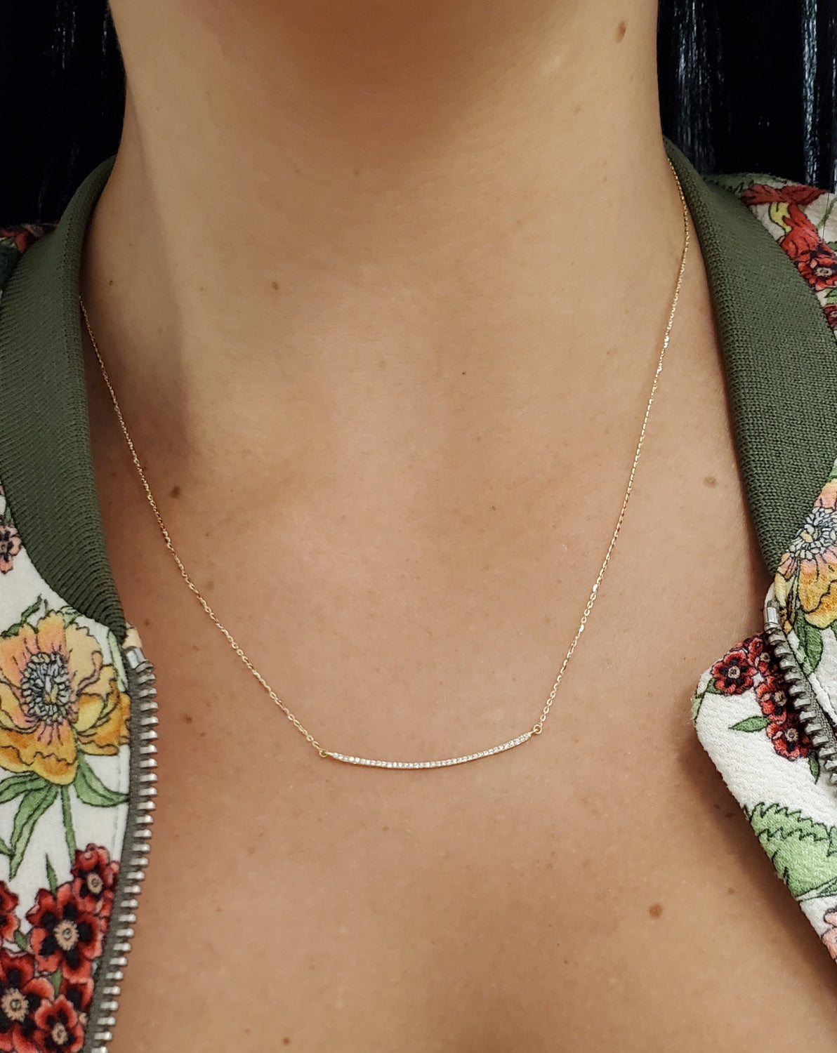 Upgrade your fashion with our exquisite 14K Gold Necklace, showcasing a delicate Curved Bar adorned with cubic zirconia stones set on a stunning diamond cut cable! This beautiful necklace is embellished with shimmering cubic zirconia stones, adding a touch of opulence and refinement to your appearance. Wear this necklace with confidence and radiate beauty and grace throughout the day. The dazzling cubic zirconias will catch the light and draw attention to your neckline, making it the perfect accessory for any event. Treat yourself or a loved one to this remarkable piece that exudes magnificence and elegance.