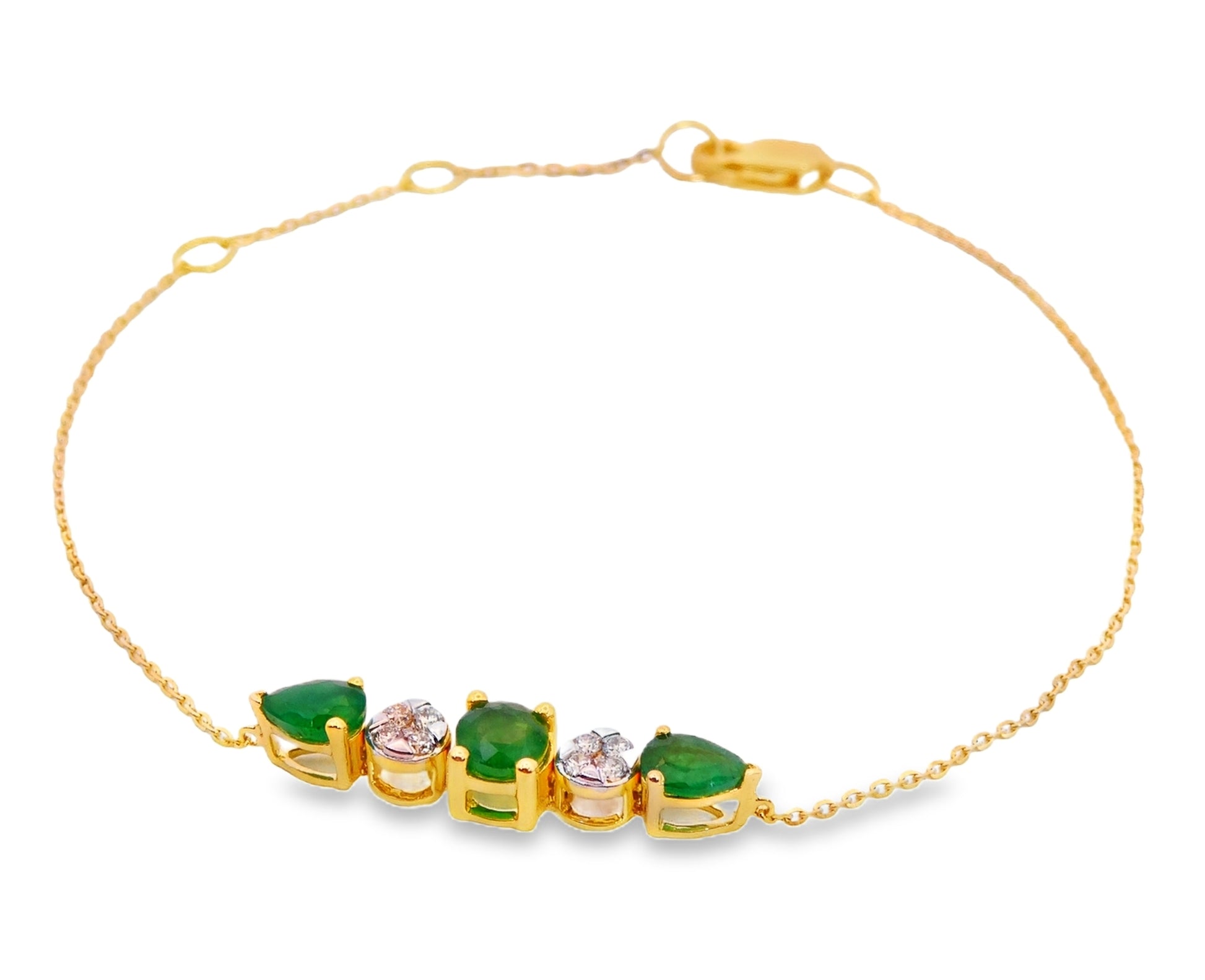 Indulge in luxury with our Trio Color Stone and Diamond Bracelet. Featuring two beautiful Pear Shape Color stones and one Round color stone accented by two diamond illusion accents, this bracelet is crafted in 14 karat solid gold with a weight in color stones of 0.25ct and a weight in diamonds of 0.16ct. The adjustable 7" cable chain adds elegance to this stunning piece, making it the perfect gift for any occasion. Choose from natural Ruby, Blue Sapphire, or Emerald to add a touch of sophistication to any outfit.
